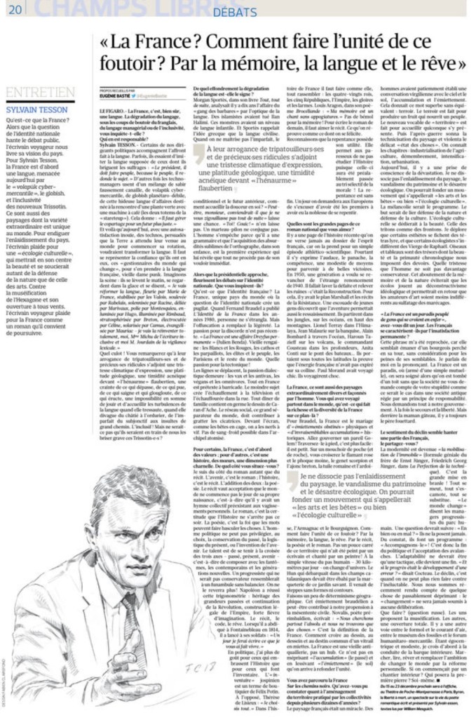 « Pour Sylvain Tesson, la France est d’abord une langue, menacée aujourd’hui par le «volapük cyber-mercantile», le globish, et l’inclusivité des nouveaux Trissotin. Ce sont aussi des paysages dont la variété extraordinaire est unique au monde. Pour endiguer l’enlaidissement du pays, l’écrivain plaide pour une «écologie culturelle», qui mettrait en son centre la beauté et se soucierait autant de la défense de la nature que de celle des arts. Contre la muséification de l’Hexagone et son ouverture à tous vents, l’écrivain voyageur plaide pour la France comme un roman qu’il convient de poursuivre.