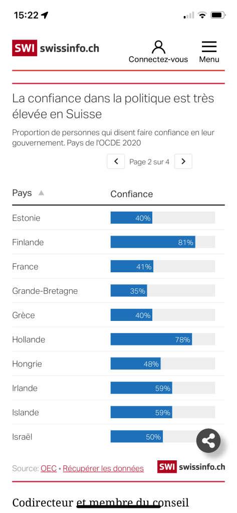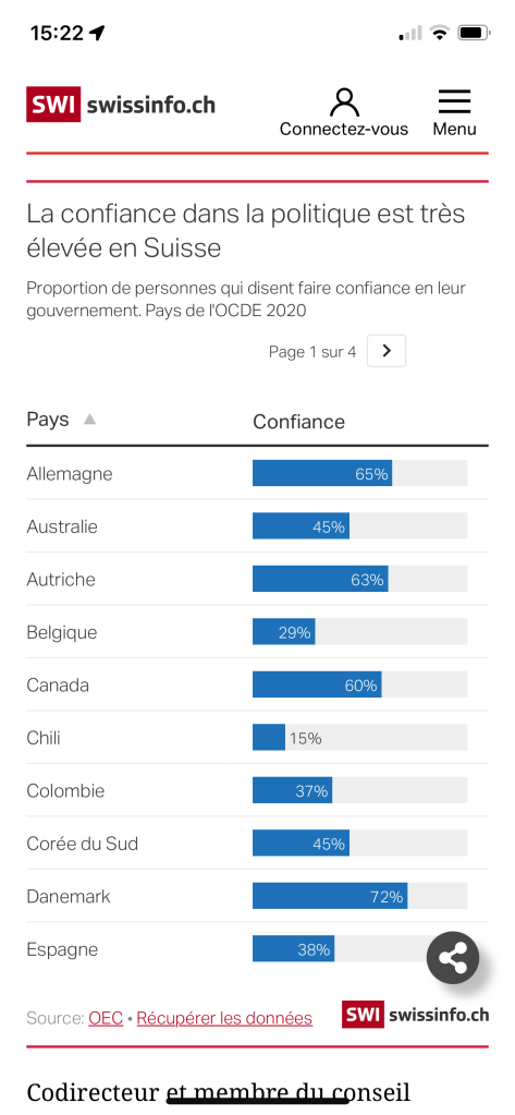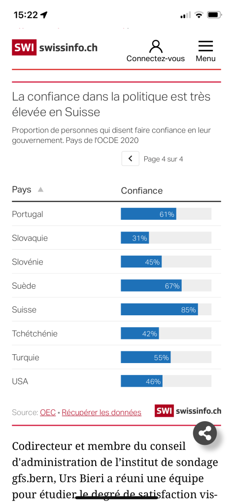 On pourrait penser que cette situation est dramatique pour le système politique helvétique, qui repose sur la stabilité et la concordance. Et pourtant, malgré la pandémie, la confiance dans le gouvernement reste élevée en Suisse. Elle comptait en 2020 la plus forte proportion de personnes déclarant faire profondément confiance à leur gouvernement de tous les pays de l’OCDE (l’Organisation de coopération et de développement économiques).