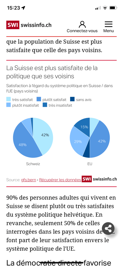 Satisfaction et système politique : 90% en Suisse 50 % chez les voisins européens