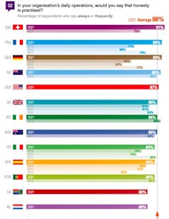 Commençons par les résultats positifs : en 2021, 86 % des employés interrogés (environ 10 000 personnes dans 13 pays, dont les principales économies européennes, les États-Unis, l’Australie et l’Afrique du Sud) affirment que l’honnêteté est toujours ou fréquemment pratiquée au sein de leur organisation. Un chiffre encourageant notamment parce qu’il est en hausse par rapport aux résultats de 2018 dans de nombreux pays. En France, par exemple, où l’IÉSEG School of Management était le partenaire national de l’IBE pour cette enquête, ce chiffre est ainsi passé à 89 % contre 71 % en 2018.