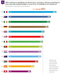 Ce chiffre apparaît particulièrement alarmant en France, où il atteint 60 % : en d’autres termes, trois employés sur cinq affirment avoir eu des problèmes pour avoir signalé des violations éthiques. Cette situation est d’autant plus sérieuse que les premiers « gardiens de l’éthique » d’une entreprise sont ses propres employés.