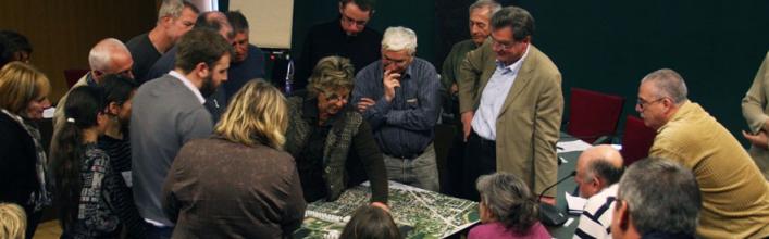 Chaque « séquence » participative commence par une réunion publique, avec en général des intervenants extérieurs, venus pour présenter une partie des enjeux. « L’objectif, c’est de mettre tout le monde au même niveau, de s’enrichir, puis de débattre. Ensuite, on demande aux citoyens volontaires s’ils veulent s’engager dans un conseil citoyen qui travaillera au long cours sur le projet »poursuit Laurent Riche. Pour compléter le conseil et diversifier les participants, d’autres habitants sont également tirés au sort sur les listes électorales de la commune. Un conseil citoyen à l’œuvre, dans l’Agora – Angélique Barys