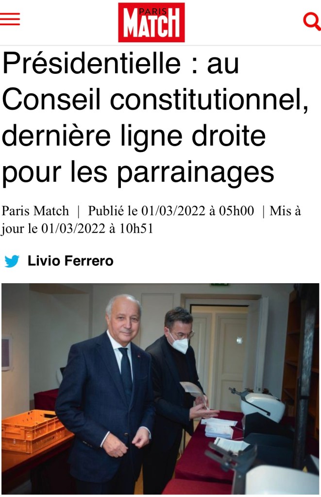 Nous vous proposons l’article de Paris Match qui montre – en photo – Laurent Fabius, posant, réceptionnant les formulaires de parrainage.