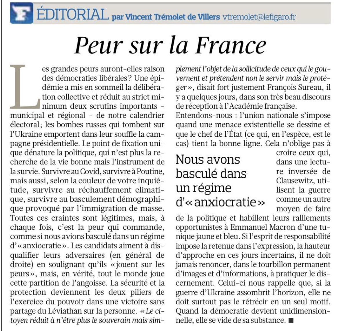 « Le point de fixation unique dénature la politique, qui n’est plus la recherche de la vie bonne mais l’instrument de la survie. Survivre au Covid, survivre à Poutine,mais aussi, selon la couleur de votre inquiétude, survivre au réchauffement climatique, survivre au basculement démographique provoqué par l’immigration de masse. «