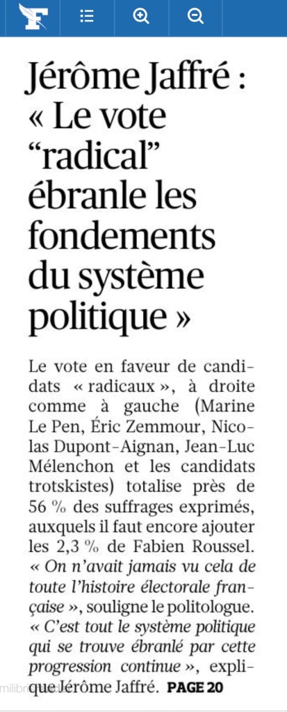 JÉROME JAFFRÉ. – L’adage célèbre «au premier tour on choisit, au deuxième on élimine» s’est trouvé inversé. Au premier tour, les électeurs ont éliminé massivement. Ce qui frappe, c’est la concentration des voix sur trois candidats qui totalisent près des trois quarts des suffrages. Pour deux d’entre eux, Emmanuel Macron et Jean-Luc Mélenchon, il s’est agi d’un vote d’anticipation comme si beaucoup de leurs électeurs étaient déjà tournés vers le second tour. Ainsi Macron a-t-il vidé le vote Pécresse à son profit pour éviter l’arrivée en tête de Marine Le Pen. Ainsi Mélenchon a-t-il vidé le reste de la gauche de ses voix pour tenter de le porter au deuxième tour. Il n’a échoué à éliminer Marine Le Pen que de 422.000 suffrages!