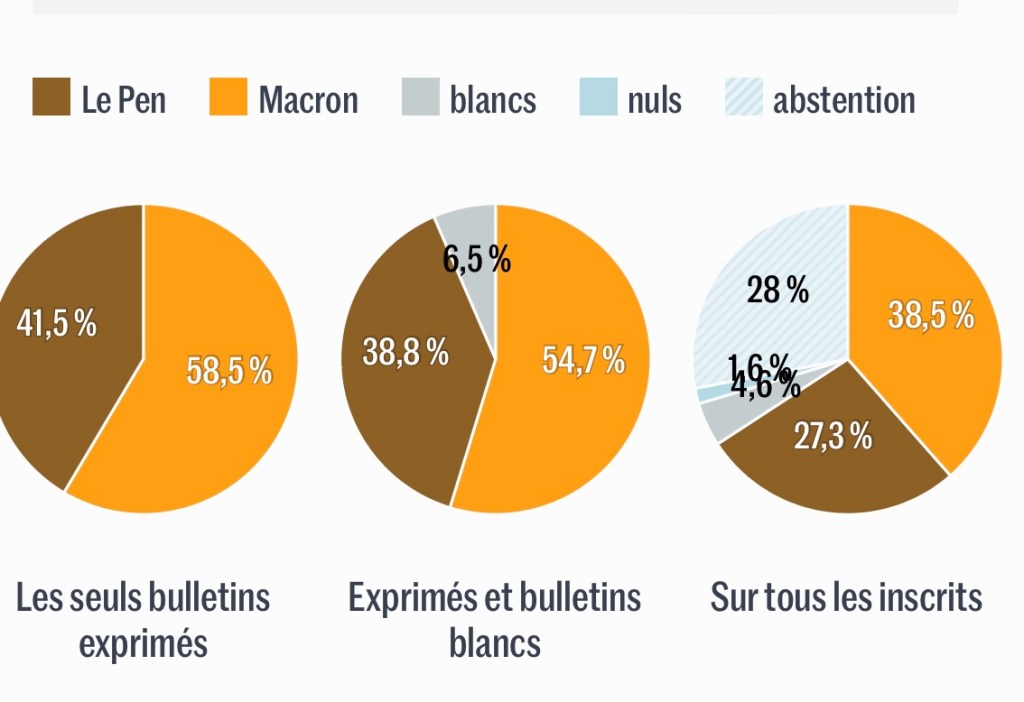 22,35 % DE VOTES « FAVORABLES « si l’on rapporte les voix aux inscrits. MACRON EST EN EFFET ELU AVEC SEULEMENT 38,52 % DES ELECTEURS INSCRITS DONT 16,17 % SONT DES VOTES « ANTI LE PEN » : SOIT UN SOLDE DE 22,35 % DE VOTES « FAVORABLES« alors que les abstentions, blanc ou nul représentent 34 %
