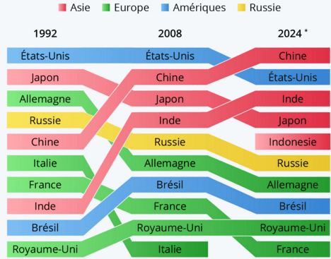 L’Inde et l’Indonésie sont entrées récemment dans le top 10 des puissances économiques et devraient atteindre respectivement le troisième et le cinquième rang en 2024. Quant au Japon, il est prévu qu’il se maintienne au quatrième rang après avoir été dépassé par son voisin chinois en 2010.