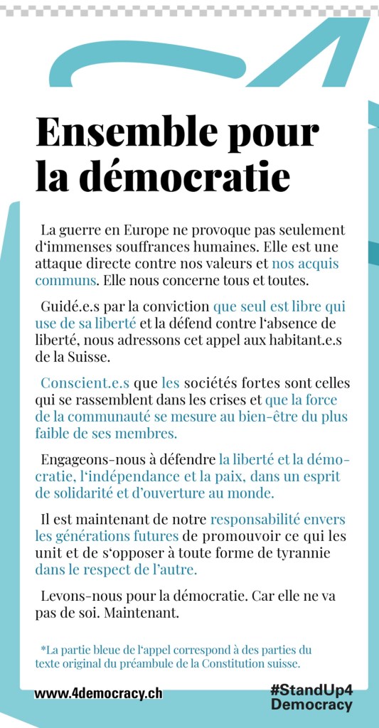 Pour les trois mois de l’agression russe en Ukraine, un appel à défendre la démocratie est lancé en Suisse