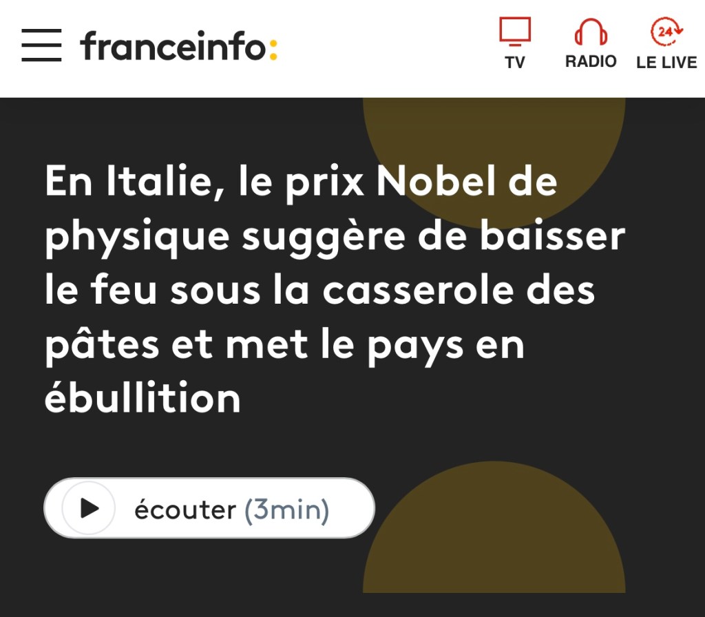 Depuis cinq jours, le prix Nobel de physique fait parler de lui et il est un peu amer. Il aurait préféré qu’on parle de sa tribune appelant les élus italiens à prendre à bras le corps la question du changement climatique. Il aurait préféré qu’on parle de son discours au Parlement, alertant sur le réchauffement, celui de la planète et non de l’eau des pâtes. Il n’empêche que les retours d’expérience fleurissent, des internautes testent la cuisson à feu doux des fusilli, pennes et autre spaghettis, et concluent que oui, les pâtes cuisent très bien quand le gaz est coupé. Ça ne vaut ni un Nobel, ni la une des journaux mais ça aura mis un peu de physique dans le débat.