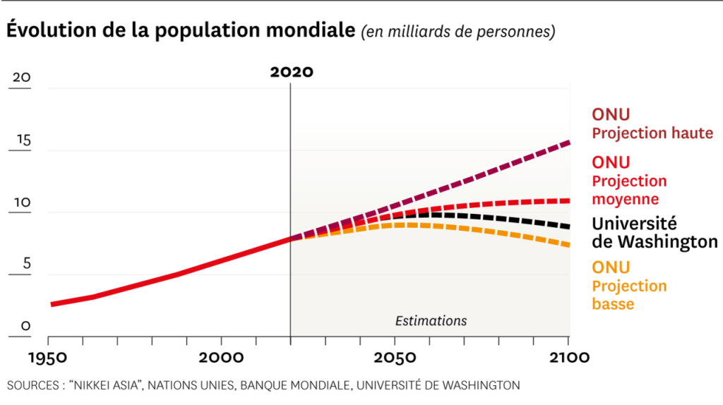 Selon le rapport « Perspectives de la population dans le monde » publié par l’ONU en juin 2019 :La population mondiale continuerait de croître pour passer à 9,7 milliards en 2050. Puis, la fécondité étant en baisse, elle augmenterait plus lentement pour atteindre environ 11 milliards d’individus en 2100. Ces chiffres correspondent au scénario moyen où la fécondité moyenne (2,43 enfants par femme en 2021) continue de baisser pour atteindre 2,2 enfants par femme en 2050 puis 1,9 en 2100. (ONU)