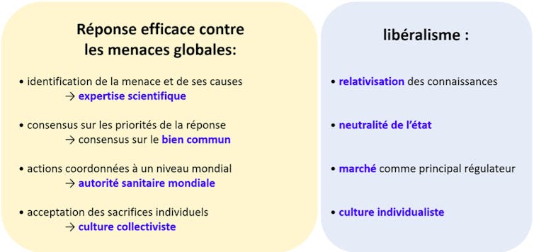 De ce qui précède, nous pouvons conclure que certaines caractéristiques du libéralisme, en particulier l’absence de normes définissant le bien commun ainsi que la place des arguments scientifiques dans le processus démocratique, le rendent mal adapté pour faire face aux menaces mondiales.