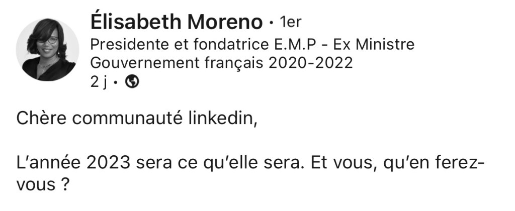 Des lecteurs de METAHODOS nous ont signalé les beaux vœux d’Elisabeth MORENO fondatrice d’EMP, ancienne ministre.