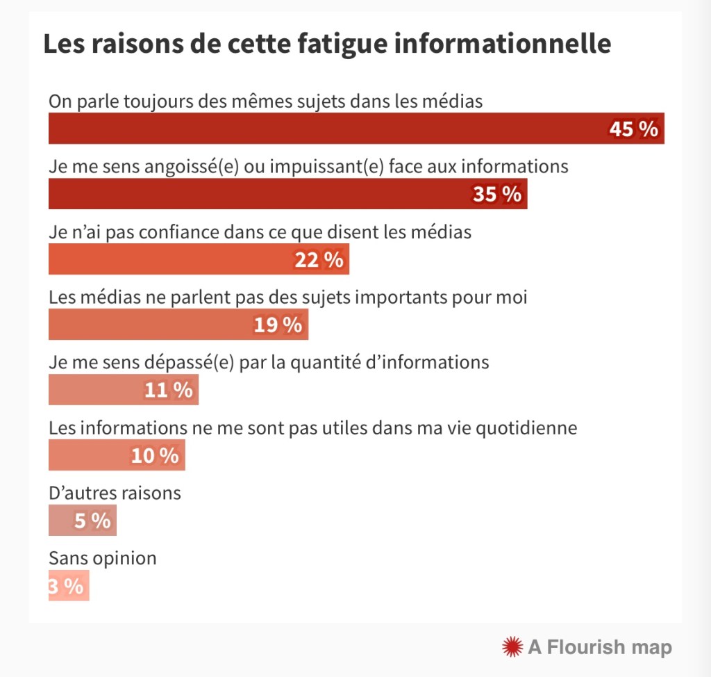 Autre enseignement de taille pour les médias : plus de la moitié des sondés disent ressentir de la lassitude par rapport à l’actualité. Ce sont en majorité des femmes et des moins de 24 ans. Parmi les raisons invoquées, la redondance des sujets abordés, mais aussi l’angoisse engendrée par la diffusion d’informations parfois anxiogènes, et le sentiment d’impuissance qui en découle.