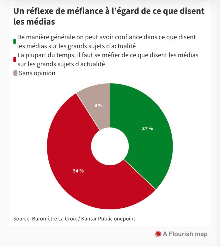 La perte de confiance dans les médias se poursuit. Plus de la moitié des sondés (54%) assure que, « la plupart du temps, il faut se méfier de ce que disent les médias sur les grands sujets d’actualité ».