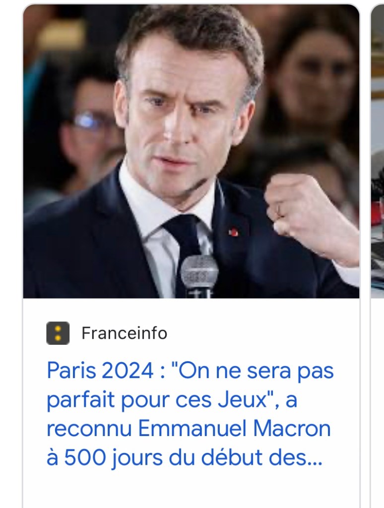 « Les sueurs froides ne manquent pas pour les organisateurs.« On doit gérer du temps long, se préparer à un événement où il y aura (aussi) du temps très court, où il y aura peut-être des crises, a prévenu le chef de l’État, accompagné des ministres des Sports, de l’Intérieur et des Transports. On ne sera pas parfait pour ces Jeux, soyons clairs (…). On sait que c’est impossible compte tenu du réseau de transport urbain qui est le nôtre. » Emmanuel Macron a ajouté devoir « mettre un petit coup de pression » sur les services concernés, en évoquant, sans plus de précisions, des « mauvaises nouvelles qui n’étaient pas forcément prévues » côté mobilité. »