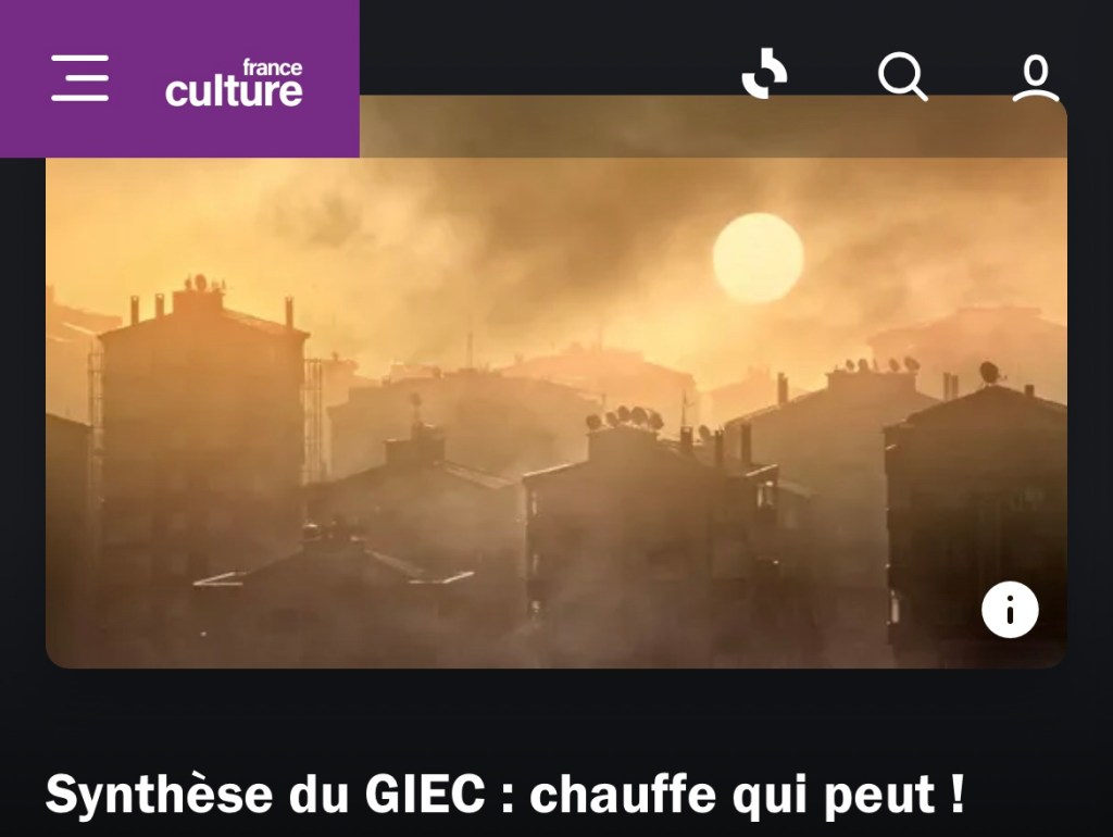 « Un résumé qui condense huit années d’analyses scientifiques et plus de 10 000 pages sur le réchauffement climatique. Ce rapport rappelle que les choix et les actions mis en œuvre dans cette décennie auront des impacts maintenant et pendant des milliers d’années. Que, comme pour une fièvre, chaque dixième de degrés compte pour la planète. Et qu’il est encore possible d’agir. Plus qu’un socle scientifique extrêmement fort, ce document apporte aussi des solutions efficaces pour guider la diplomatie mondiale. » EXTRAIT DE L’ÉMISSION PROPOSÉE CI CONTRE