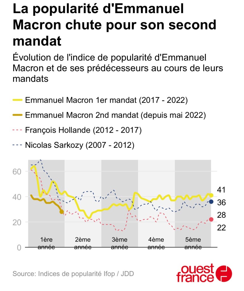 Inflation, réforme des retraites, concerts de casseroles à chacun de ses déplacements… En ce mois d’avril 2023, le président réélu est vraiment loin de faire l’unanimité. Sa cote de popularité ne fait que baisser et s’approche de son pire niveau : selon le baromètre YouGov du site The Huffington Post, l’évaluation la plus pessimiste estime à 22 % le pourcentage d’opinion favorable envers le chef de l’État, tandis que celui-ci s’élève à 26 % selon un sondage de la société BVA réalisé pour la radio RTL.