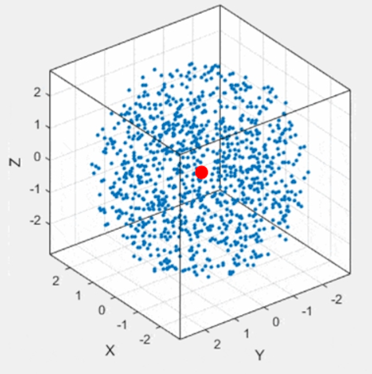 Dans une configuration où chaque votant donne une note à chaque candidat, chaque votant peut être représenté dans l’espace par un point dont les coordonnées sont ses évaluations données aux candidats. Un exemple pour une élection avec trois candidats est illustré dans la figure suivante : chaque axe représentant un candidat et chaque point un votant, les évaluations entre -2 et 2 ont été générées au hasard pour cette figure :
