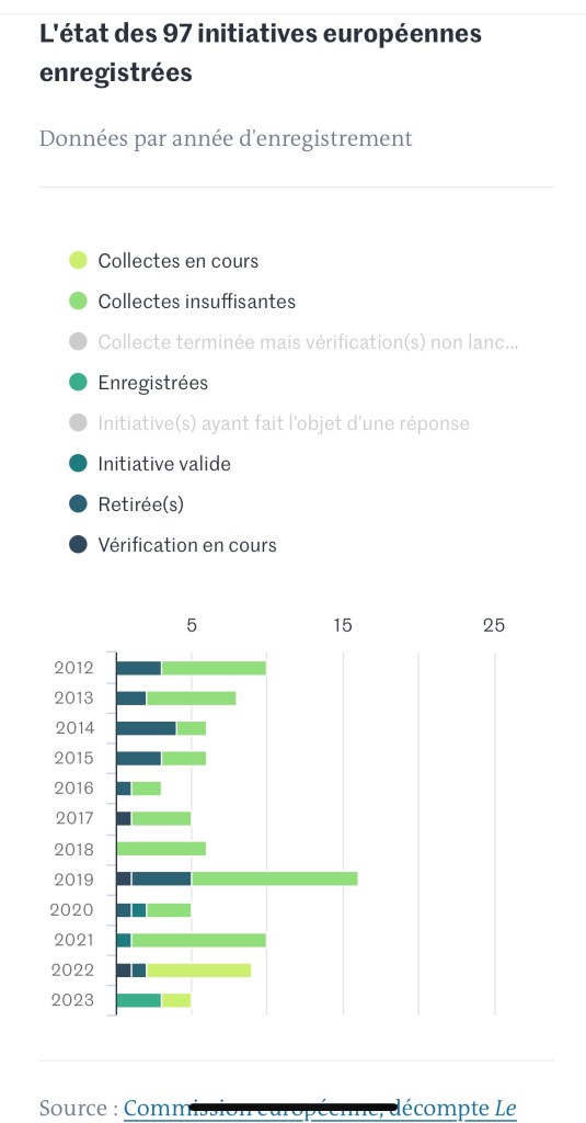 Malgré sa décennie d’existence, l’ICE peine à émerger comme un outil d’initiative employé par les Européens. Seule une dizaine de millions de citoyens européens, depuis 2012, se sont saisis de l’outil, et à peine plus de 300 000 en France.