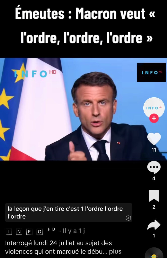« Interrogé sur les violences urbaines, ce dernier a insisté sur le fait qu’“il n’y a pas de liberté sans l’ordre républicain”, et a notamment souhaité, en France, “un retour de l’autorité à tous les niveaux”.