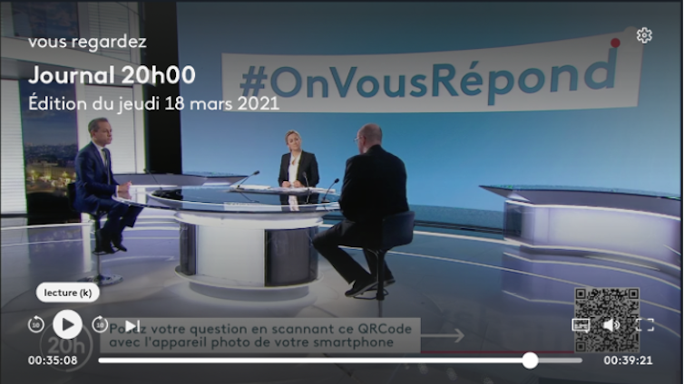 Dans les JT, la relation entre la rédaction, incarnée par le(s) journalistes présentateurs et les publics est traditionnellement mise en scène par le « regard caméra » et la proximité psychologique imaginée, manifestée par des formes d’adresse comme de chaleureux « vous » et « chers téléspectateurs, chères téléspectatrices » « merci de nous avoir suivis ». La mise en scène de ce relationnel est aujourd’hui représentée par les rubriques « #Le20hvousrépond » sur TF1 et « #OnVousRépond » sur France 2, qui offrent la possibilité aux téléspectateurs d’intervenir et de réagir aux contenus du journal.