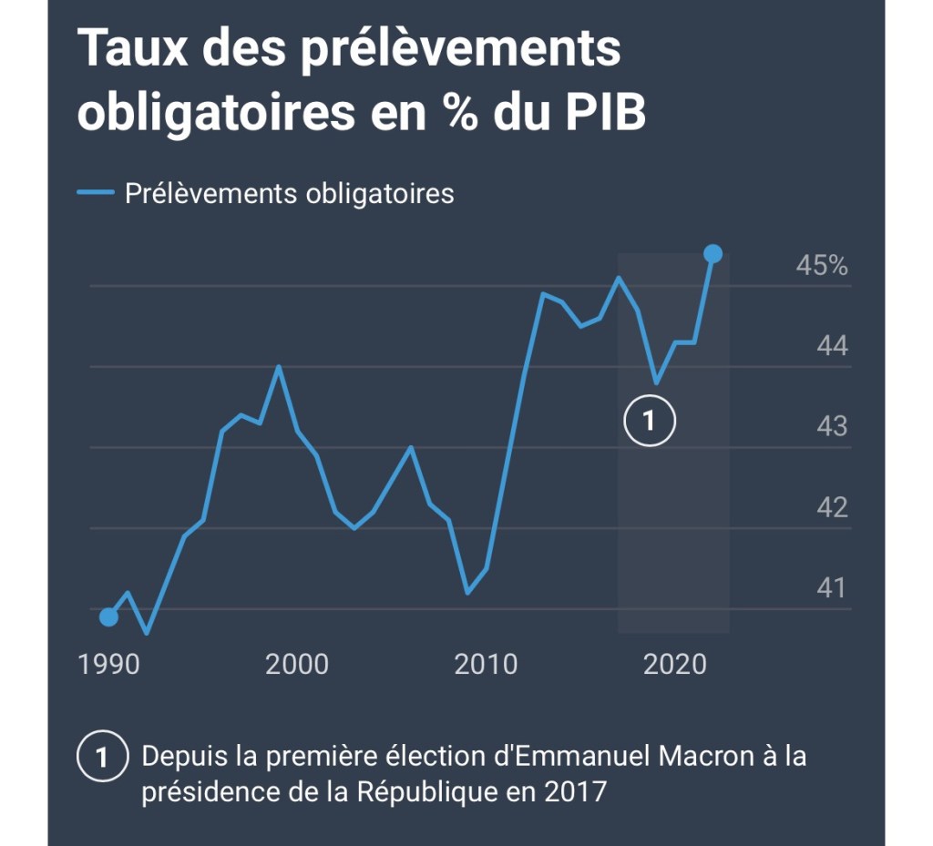 C’est ce que souligne le site Fipeco : si les prélèvements obligatoires ont d’abord diminué au début du premier quinquennat d’Emmanuel Macron, notamment entre 2017 et 2019, ils sont repartis à la hausse depuis 2020. Jusqu’à atteindre un niveau record en 2022, représentant 45,4% du produit intérieur brut (PIB). VOIR LA NOTE 2. CI CONTRE