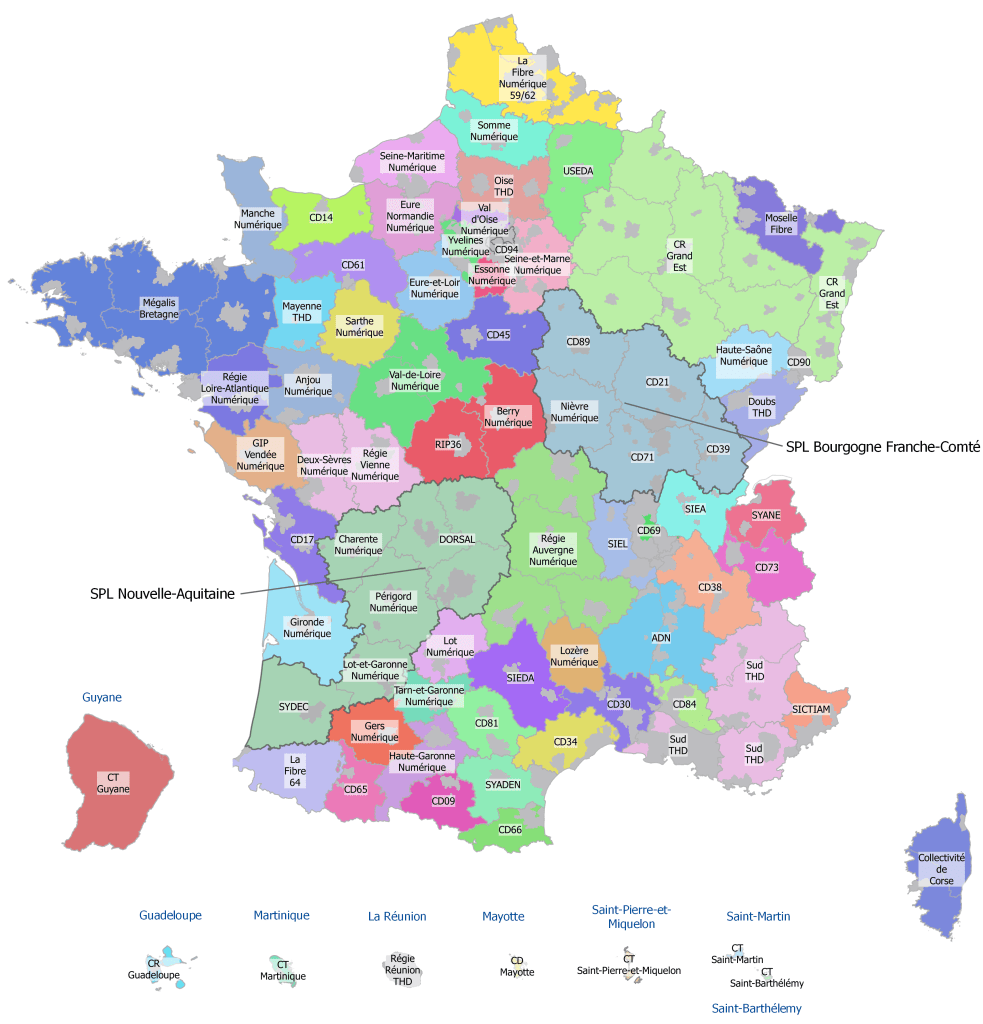 NB : Ces sont les collectivités territoriales, principalement les départements, qui ont pris les initiatives de couverture et ont assurés en majorité le financement des investissement, l’Etat se comportant en censeur et apportant son financement jugé trop faible et trop tardif – il ainsi freiné le déploiement effectif et découragé certains opérateurs publics et privés.