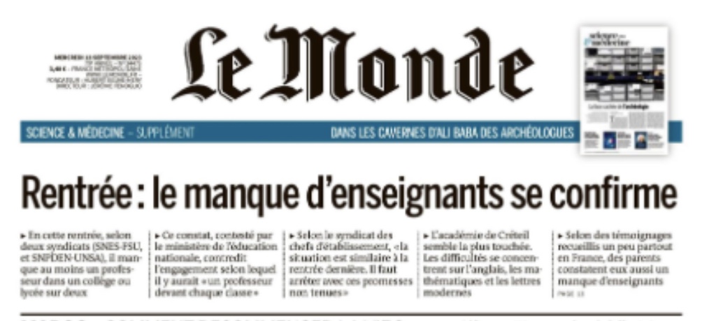 Il manque au moins un professeur dans 60 % des collège ou lycée, LIT-ON DANS L’ARTICLE DU MONDE PROPOSÉ CI CONTRE