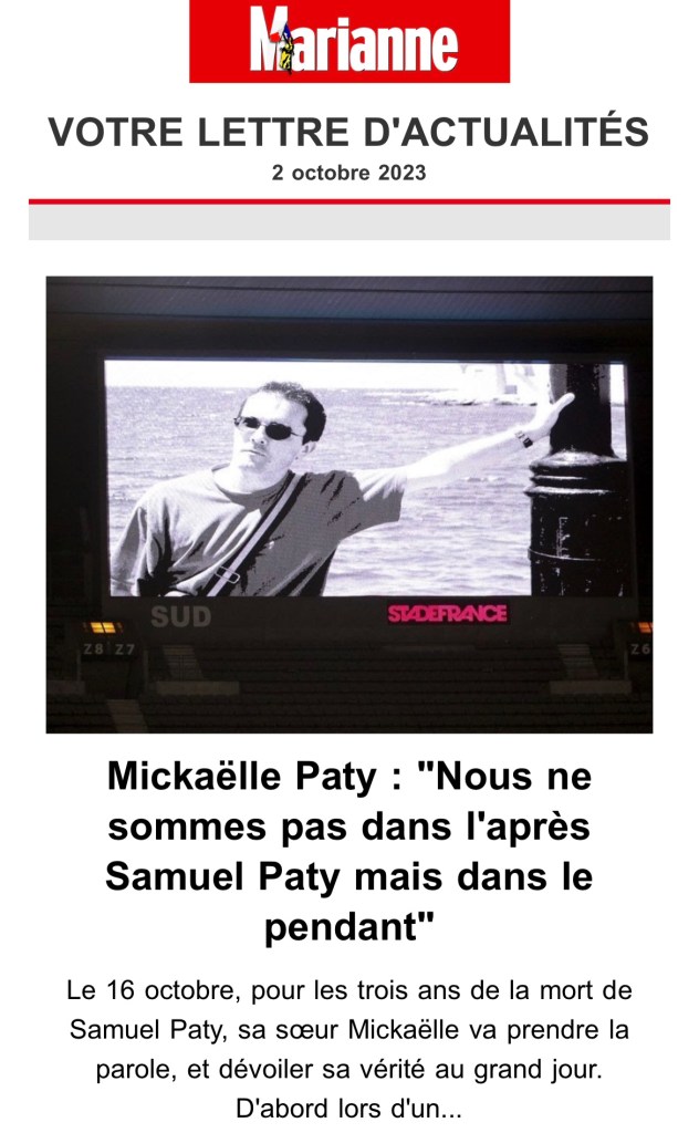 Le 16 octobre, pour les trois ans de la mort de Samuel Paty, sa sœur Mickaëlle va prendre la parole, et dévoiler sa vérité au grand jour. D’abord lors d’un évènement exceptionnel dont « Marianne » est partenaire (« Honorer Samuel Paty, aider l’école »), puis le lendemain (17 octobre) lors de son audition devant les sénateurs.