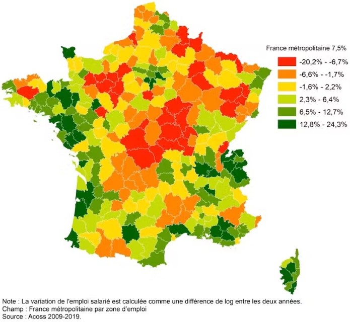 Variation de l’emploi salarié privé entre 2009 et 2019. | Insee CLAP / Calculs et cartographie: EconomiX / Document fourni par les auteurs
