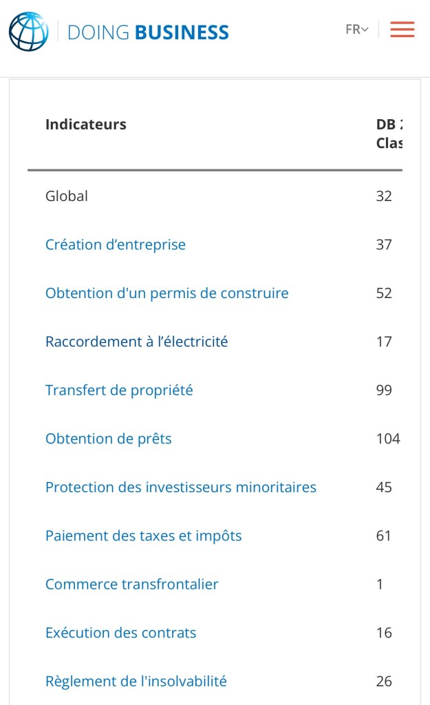 En 32eme place dans l’indicateur de la facilité à faire des affaires de la Banque mondiale (Doing Business) et 33eme . dans l’indicateur de la réglementation des marchés de produits de l’OCDE. ( voir plus loin Séquence 2 )