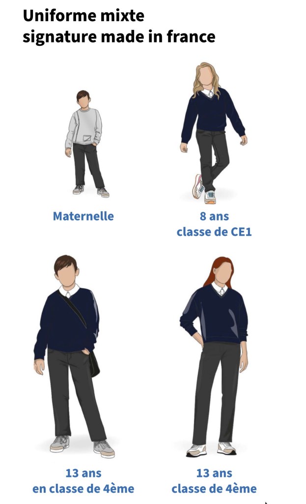 L’uniforme retenu est simple, sobre et «sportswear», loin des tenues strictes que l’on trouve dans certains établissements sous contrat ou du traditionnel blazer anglais et autres uniformes asiatiques. Avec cette tenue clé en main, le gouvernement veut «alléger la logistiquepour les établissements et les parents». Il entend aussi donner un coup de pouce à l’expérimentation voulue par le président Macron et Brigitte Macron, au-delà des collectivités de droite. Selon France Info, sur la centaine d’établissements envisagés, une soixantaine est déjà identifiée, parmi lesquels 39 écoles, 11 collèges et 10 lycées.