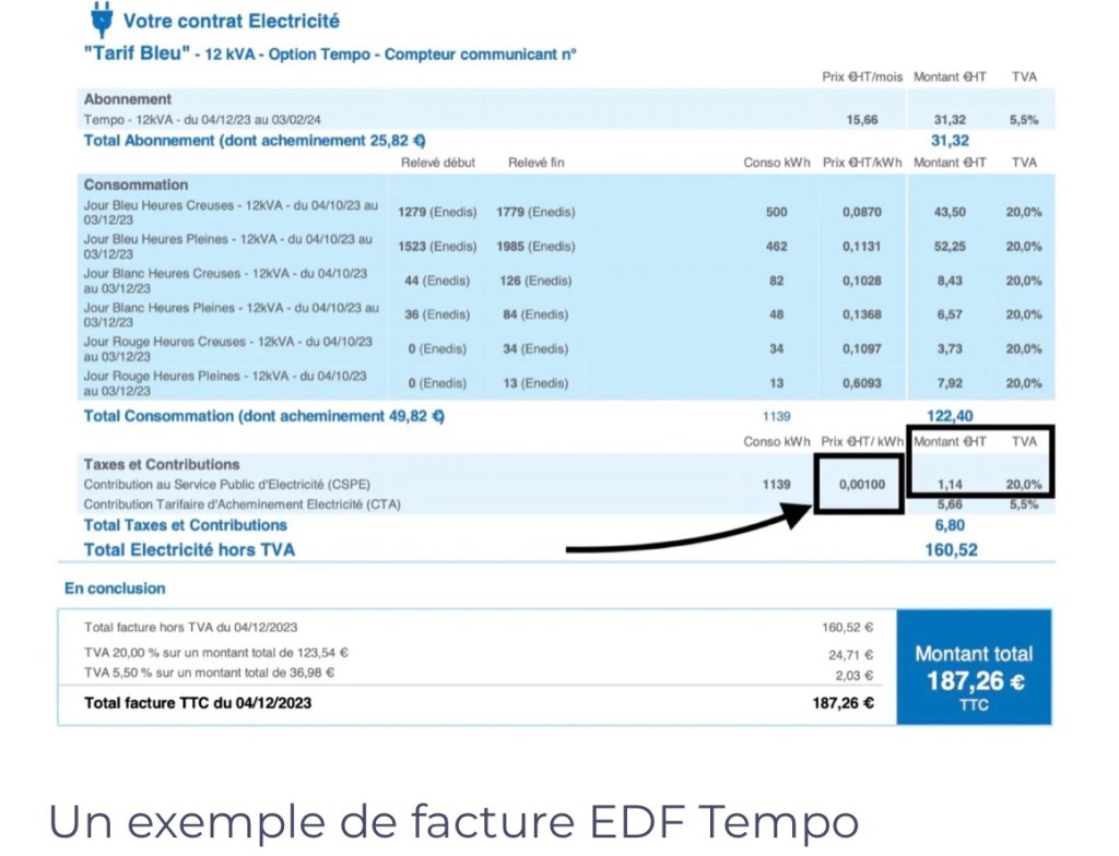 Lorsque vient le moment de régler sa facture d’électricité, plusieurs composantes rentrent en ligne de compte. L’abonnement dans un premier temps, qui est à prix fixe et indépendant de la consommation, et ensuite la consommation hors taxes. Une fois ceci mis de côté, diverses taxes —et taxes sur les taxes— sont appliquées : la Contribution au Service Public d’Electricité (CSPE) et la Contribution Tarifaire d’Acheminement Electricité (CTA) dans un premier temps, et enfin la TVA à 5,5 % sur l’abonnement et sur la CTA et à 20 % sur la consommation et la CSPE.