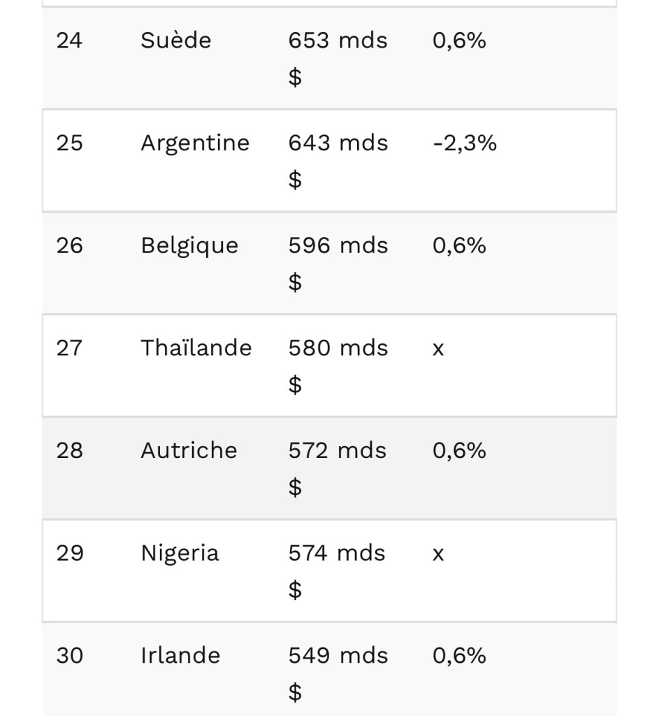 Des pays comme l’Irlande, la Suisse, et la Suède, bien que relativement petits en termes de PIB total, maintiennent des économies stables et robustes avec une croissance modeste.