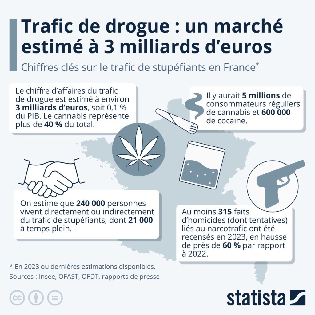 ARTICLE : 200.000 personnes en activité, 3,5 milliards d’euros de chiffre d’affaires… Le poids colossal du trafic de drogue en France