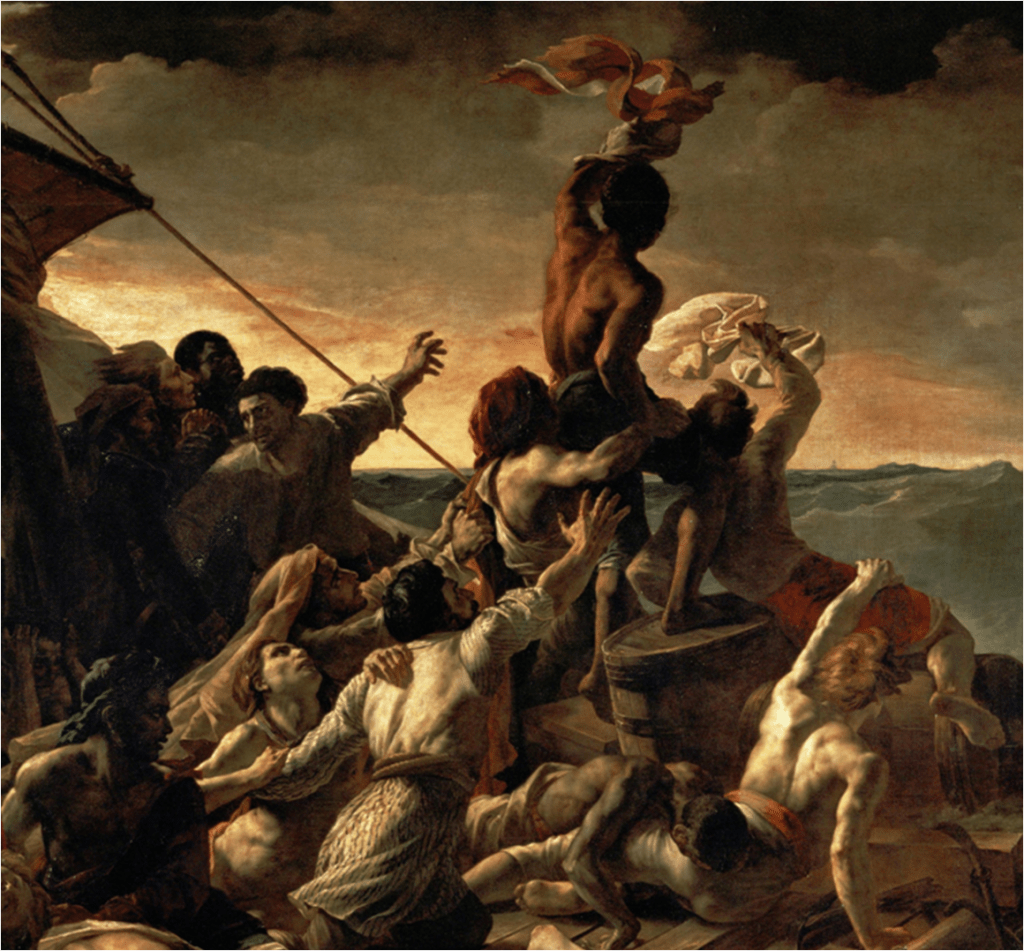 La situation était déjà grave à bord, elle se fait désespérée. L’aspirant Coudein peut bien faire dresser une voile de fortune, l’aide-chirurgien Savigny peut bien distribuer ce qu’il reste de biscuits: sans gouvernail et sans carte, le radeau entame une dérive lente et mortelle sous un ciel de plomb. Dès la première nuit, beaucoup tombent à l’eau, les jambes parfois brisées par le jeu des planches mal jointes qui font office de plancher. À bord, la division s’installe entre deux groupes, celui des officiers qui ont gardé leurs armes et celui des soldats, désarmés mais menaçants.