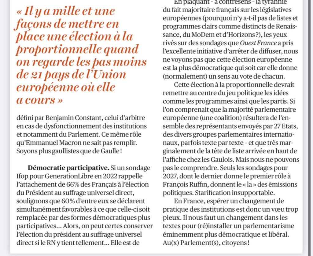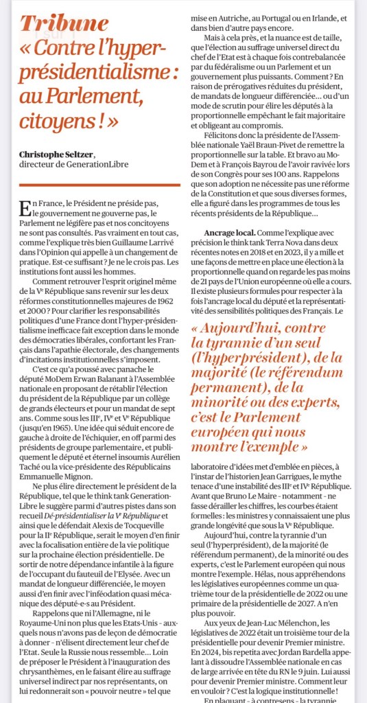 Dans l’Opinion, le directeur de Génération Libre Christophe Seltzer appelle à « sortir de l’hyper-présidentialisme inefficace et à renforcer le rôle du Parlement en France pour une démocratie participative… réelle ! «