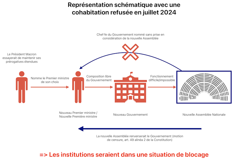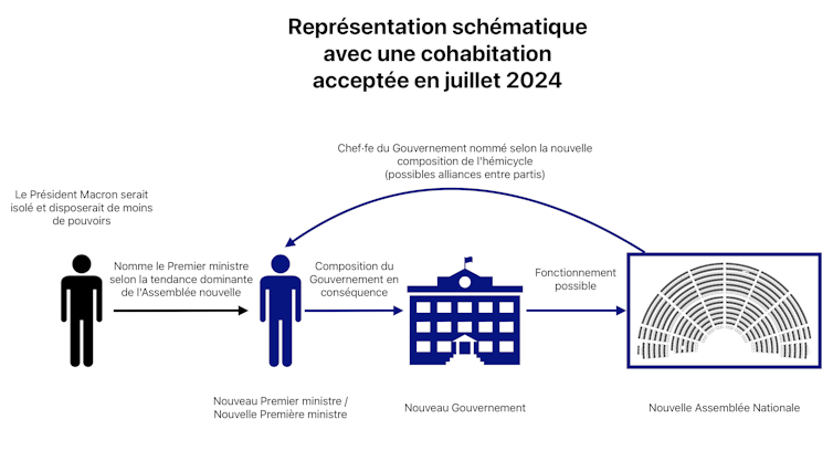 Avec une Assemblée qui pourrait basculer vers l’extrême droite, le chef de l’État n’aurait pas d’autre choix que de nommer un premier ministre issu de cette tendance politique – au risque, sinon, d’un renversement de gouvernement puisque ce dernier est responsable devant l’Assemblée. Le premier ministre, lui, aurait les mains libres pour composer son gouvernement et, par la suite, déposer des projets de loi (l’Assemblée peut déposer des propositions de loi mais ces dernières sont moins nombreuses que les projets du gouvernement).