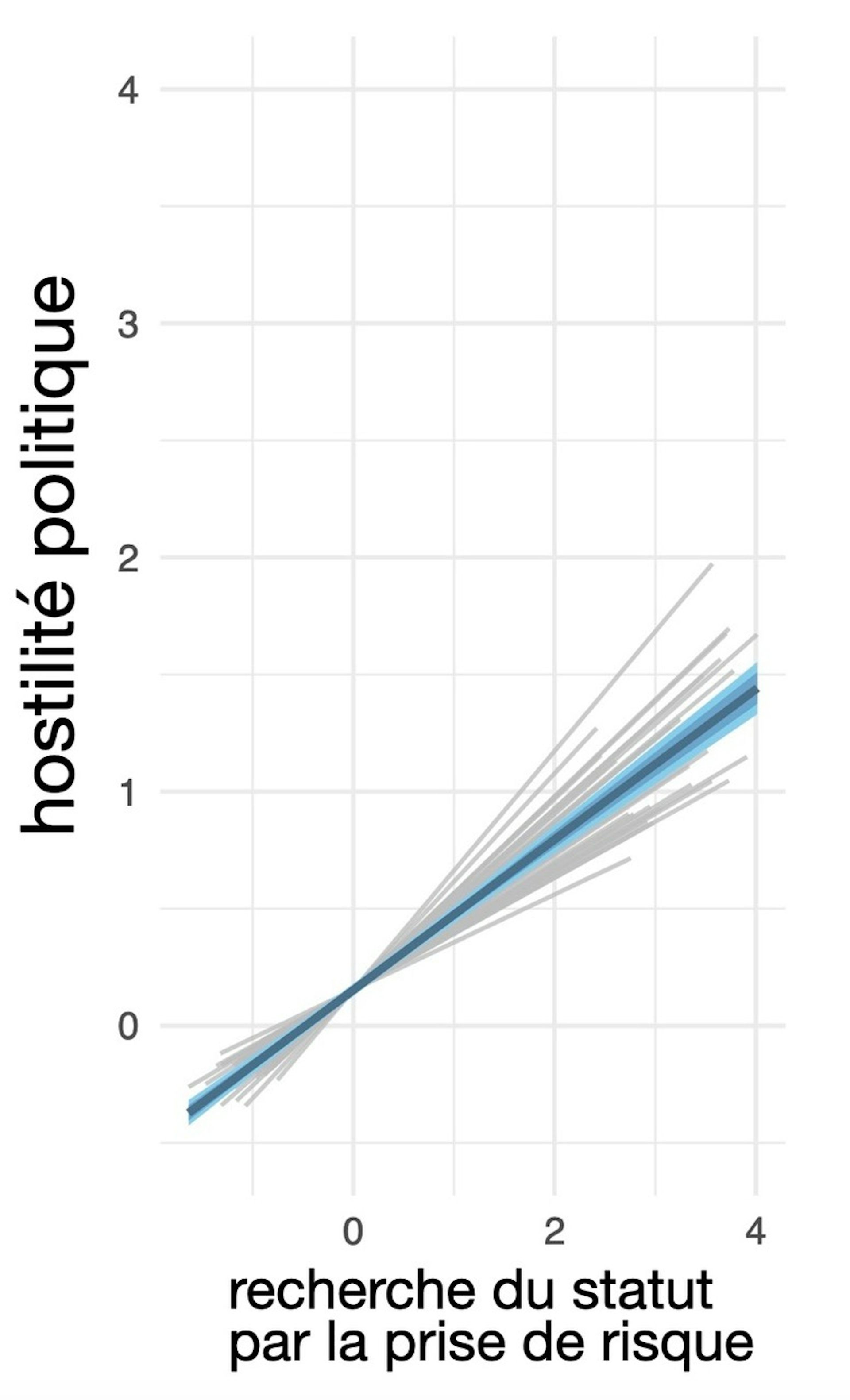Répliquant une étude antérieure, nous trouvons par ailleurs que ces individus motivés par la recherche de statut par la prise de risque, qui admettent le plus se comporter de manière hostile sur Internet, sont aussi ceux qui sont plus susceptibles d’interagir de manière agressive ou toxique dans des discussions en face à face (la corrélation entre l’hostilité en ligne et hors ligne est forte, de l’ordre de β = 0,77).