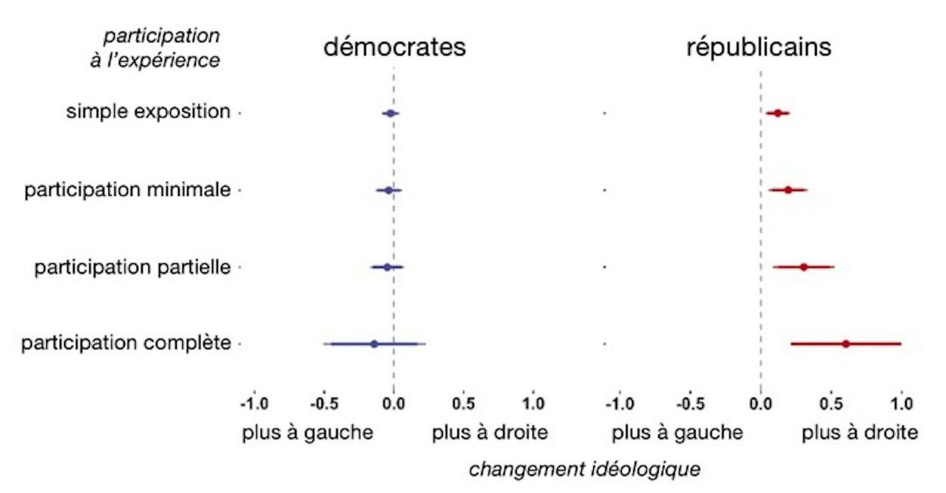 Prenant appui sur des études expérimentalesdéployées sur Twitter et des interviews de militants démocrates et républicains menées avec son équipe, le sociologue Chris Bail nous avertit dans son livre Le prisme des réseaux sociaux. D’après lui, une exposition répétée à des contenus peu convaincants et moqueurs produits par nos ennemis politiques peut paradoxalement renforcer les partisans dans leurs positions et identitéspréexistantes, plutôt que de les rapprocher intellectuellement et émotionnellement les uns des autres.