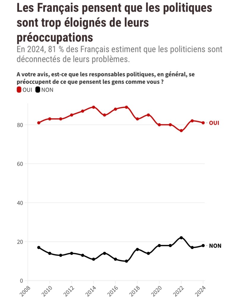 Ce sentiment de méfiance à l’encontre des politiques reste plus ou moins stable depuis la crise du Covid-19, à des niveaux cependant élevés. « Le système demande aux Français d’être de bons citoyens, ils ont le sentiment de l’être. On leur demande de bien travailler à l’école, ils ont le sentiment qu’ils l’ont fait. On leur demande d’être de bons contribuables, ils le sont très largement et, en échange, ils ont le sentiment que la promesse égalitaire n’est pas tenue », explique Bruno Cautrès. D’autant que 81 % des Français estiment que les responsables politiques ne se préoccupent pas de ce qu’ils pensent, nourrissant un sentiment d’abandon.