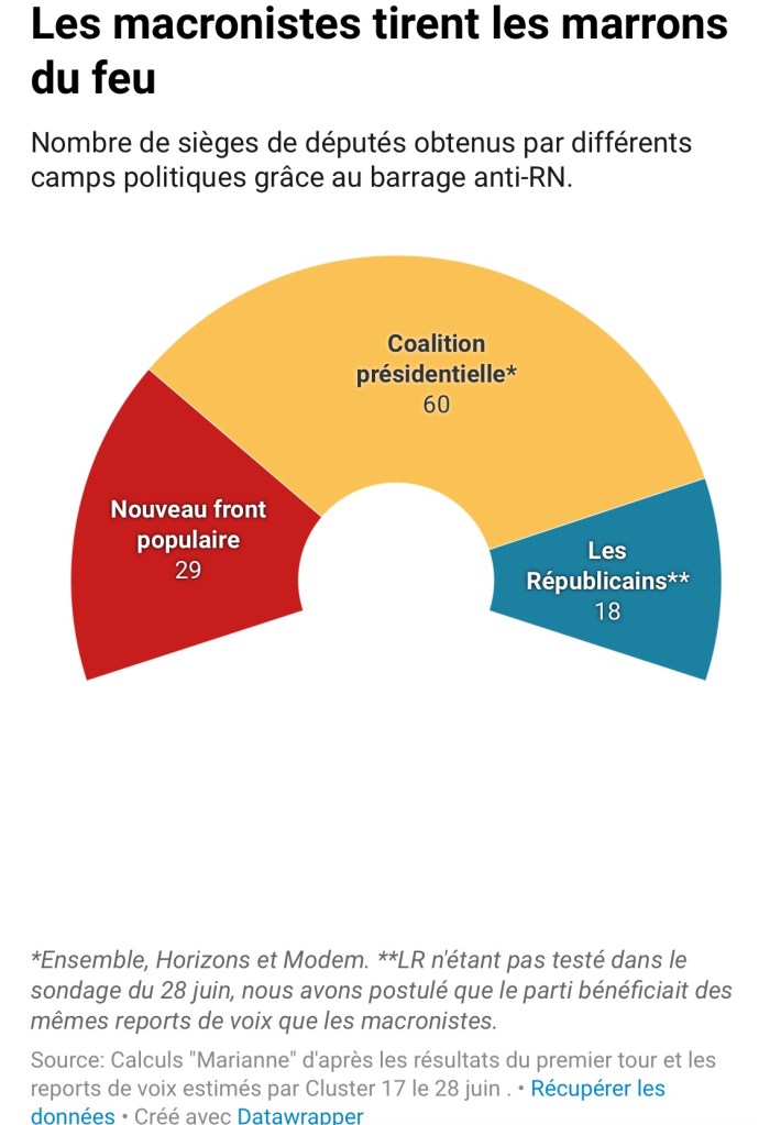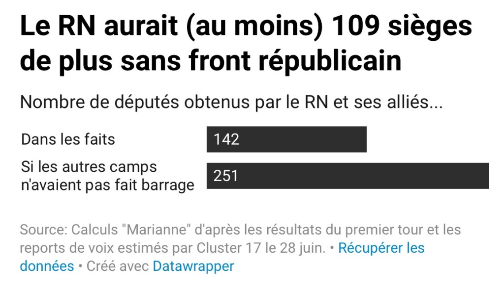 Sans le barrage dit « front républicain » – lancé simultanément dès les résultats du 1er tour des législatives par Macron et Melenchon – le RN et ses alliés auraient obtenu 251 sièges selon simulation de MARIANNE , alors qu’ils n’en ont décroché que 142 dans les faits. Le « front républicain » a ainsi envoyé 109 députés d’autres bords à l’Assemblée