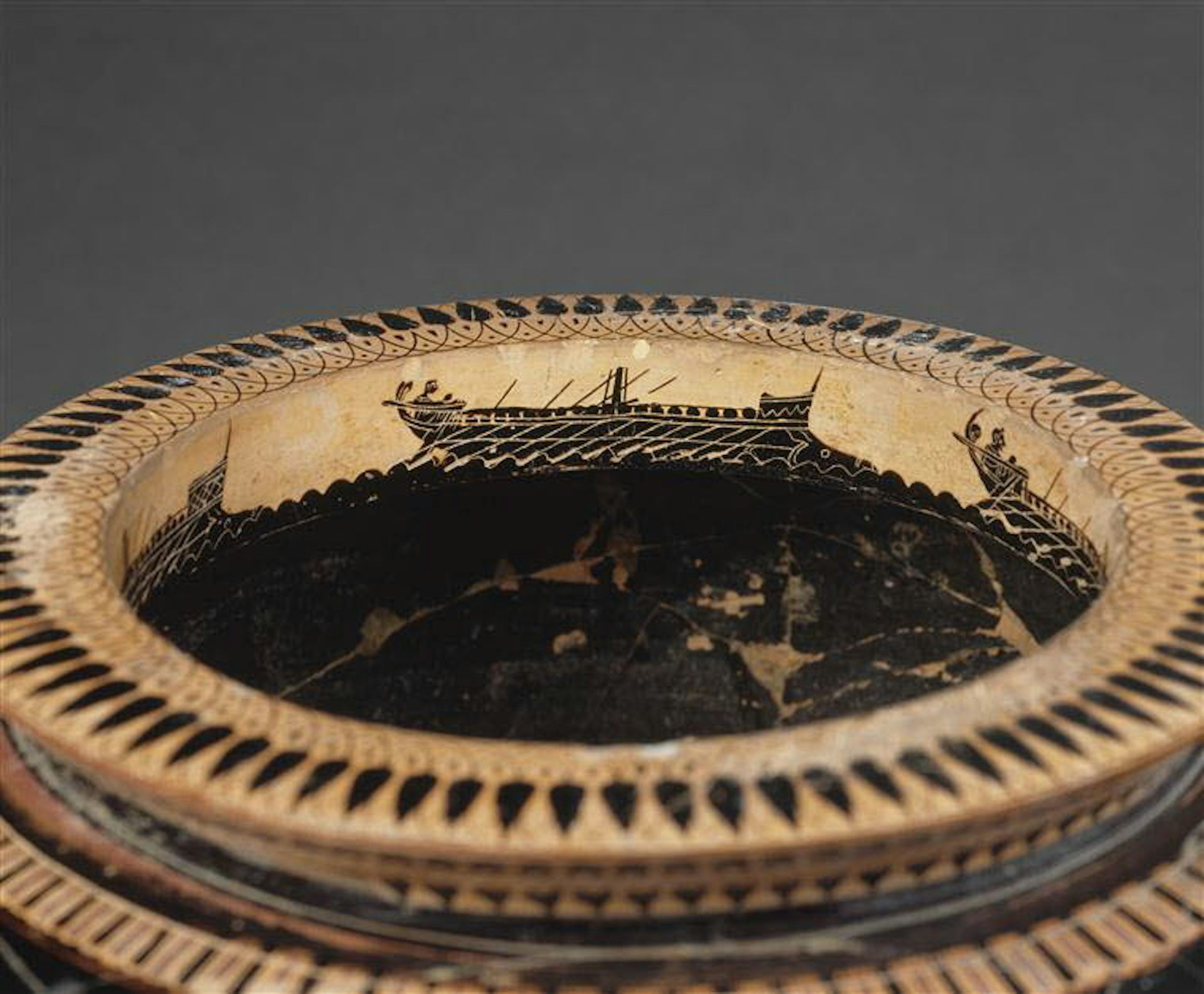 C’est principalement par la pratique du banquet funéraire que cela s’observe, pratique aussi bien répandue dans le monde grec que le monde étrusque. La liaison entre mer et vin dans a la pensée antique s’illustre parfaitement dans les récits homériques à travers l’expression de « mer vineuse ». Cette expression littéraire s’illustre également dans les décors des céramiques qui servent à la pratique du banquet. Le vin, pur ou mélangé, représente la mer sur laquelle voguent les navires qui figurent sur les décors peints des vases et des coupes.