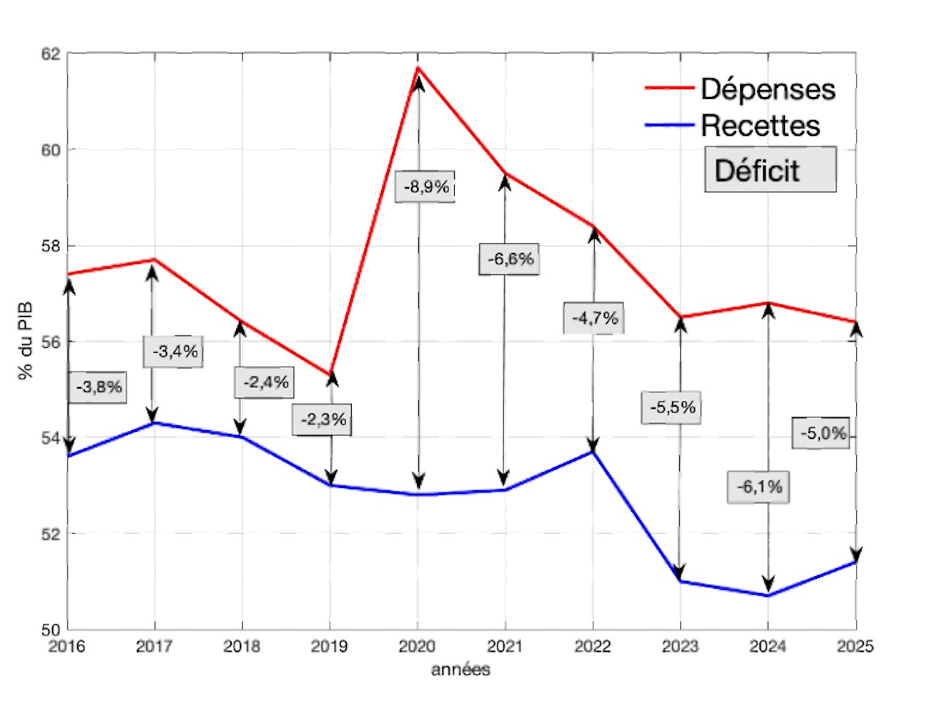 Ces réductions de dépenses s’accompagnent d’une augmentation de 19,3 Md€ des prélèvements. En 2025, le gouvernement dépensera 56,4 % du PIB (contre 56,8 % en 2024) et collectera des recettes à hauteur de 51,4 % du PIB (contre 50,7 % en 2024).
