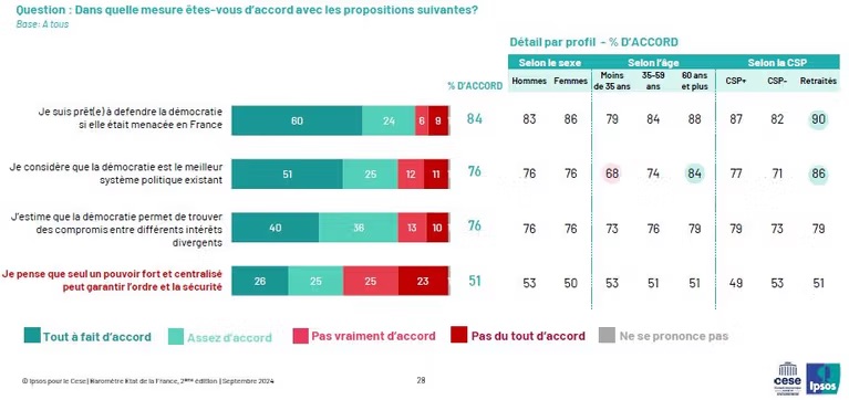 Des chiffres qui méritent toutefois d’être nuancés. Selon ce sondage, 84% des Français se disent prêts à défendre la démocratie si elle était menacée en France et 76% d’entre eux estiment que la démocratie est « le meilleur système politique existant ». https://623e60a5ee1ae1ef8f09b882e68962ba.safeframe.googlesyndication.com/safeframe/1-0-40/html/container.html?n=0