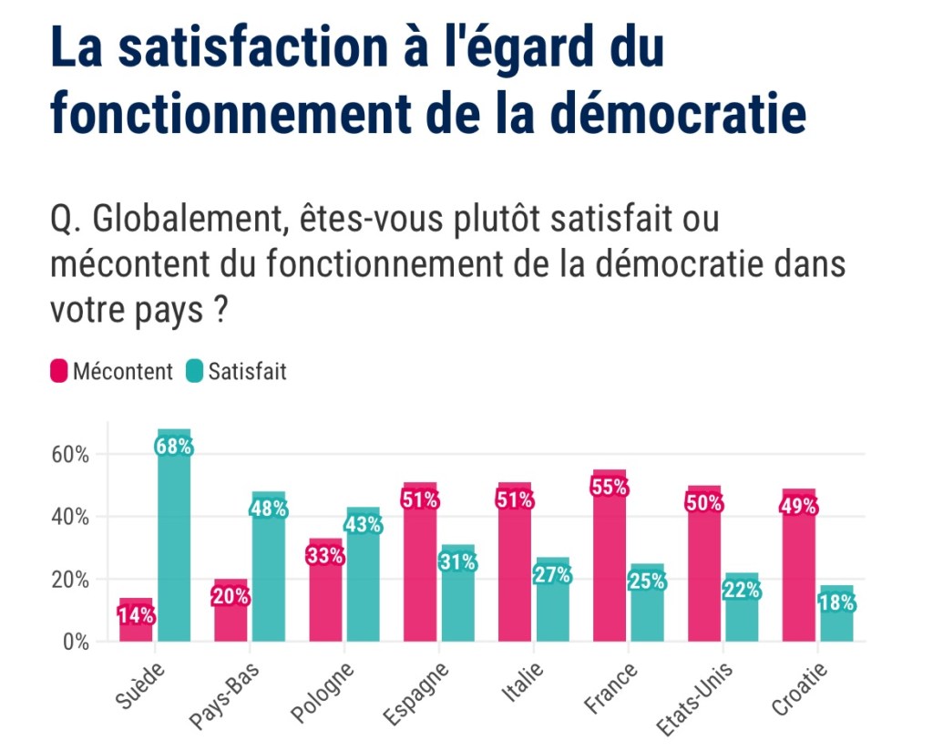 Les citoyens de la plupart des pays démocratiques se montrent mécontents vis-à-vis de l’action de leurs dirigeants politiques et plus largement du fonctionnement des institutions. Pour autant, on ne constate pas de rejet du principe démocratique en lui-même, bien au contraire : les citoyens veulent tout simplement des changements pour mieux se faire entendre et pour avoir des politiques publiques correspondant mieux à leurs souhaits.