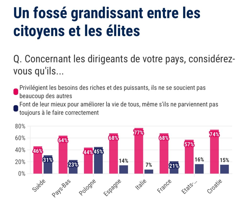 Les citoyens ressentent un important fossé entre eux et leurs dirigeants politiques, avec la conviction que le système démocratique favorise principalement les élites économiques et politiques à leur détriment. Ce sentiment est particulièrement marqué en France (57%), en Italie (60%) et en Croatie (77%), où il est fortement partagé par la population.