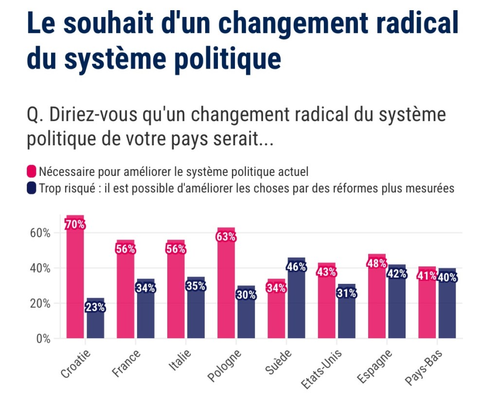 Dans plusieurs pays, une majorité de citoyens exprime un désir manifeste de transformation radicale du système politique comme en Croatie (70%), en Pologne (63%), en France (56%) et en Italie (56%). En revanche, les opinions sont plus divisées aux États-Unis, en Espagne, aux Pays-Bas et en Suède, où une partie notable de la population préfère des réformes institutionnelles progressives ou limitées.