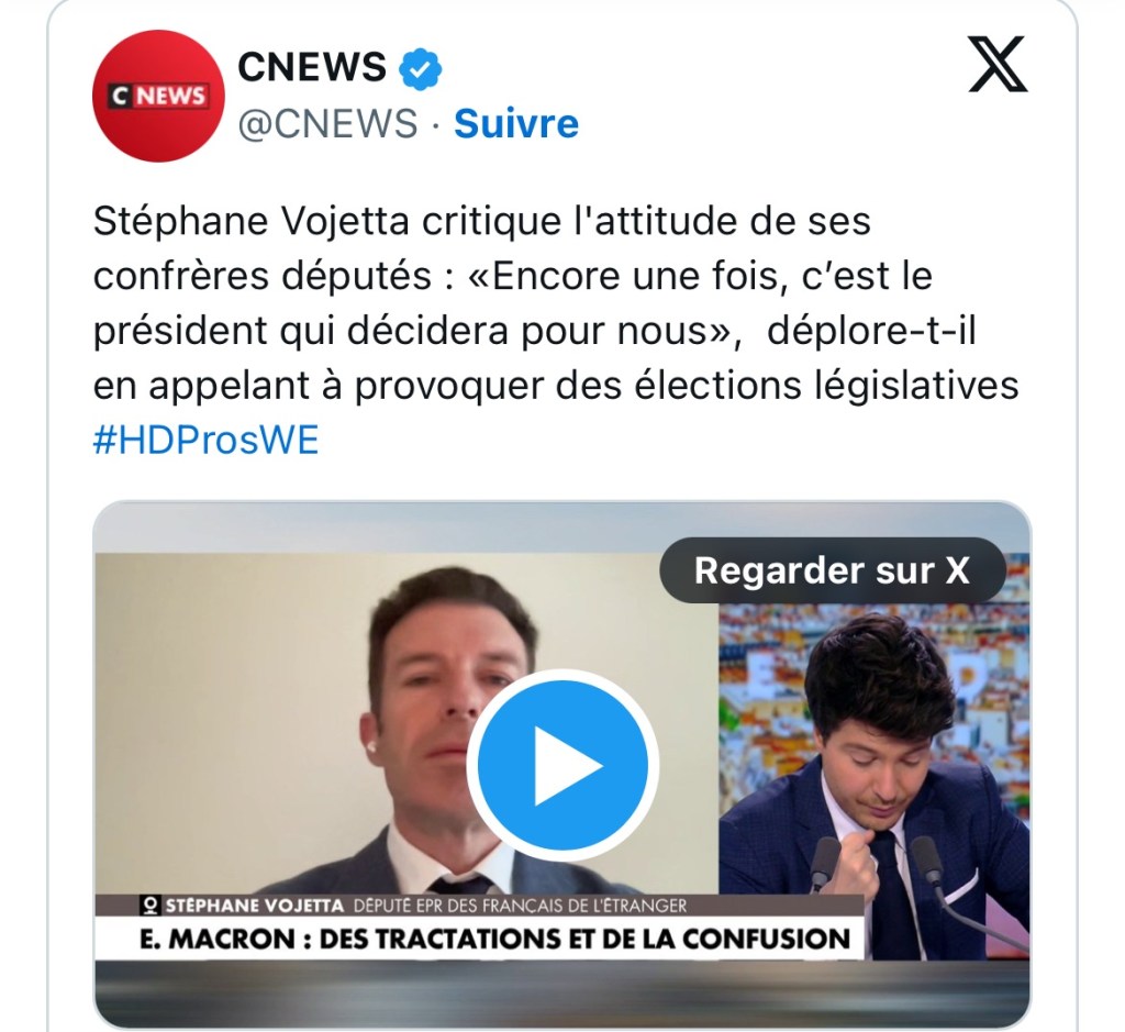 D’ailleurs Stéphane Vojetta le sait bien puisqu’il accuse les députés qui disent que la seule solution pour sortir de la crise politique est la démission d’Emmanuel Macron d’être « des menteurs et des lâches ». Sa proposition a déjà été balayée par Antoine Léaument, député La France insoumise de la dixième circonscription de l’Essonne avec cette réponse(Nouvelle fenêtre) : « Vous êtes vraiment en train de dire que la démission de 577 personnes est possible, pour éviter la démission d’un seul ? »Antoine Léaument poursuit en appelant le président de la République à quitter son poste.