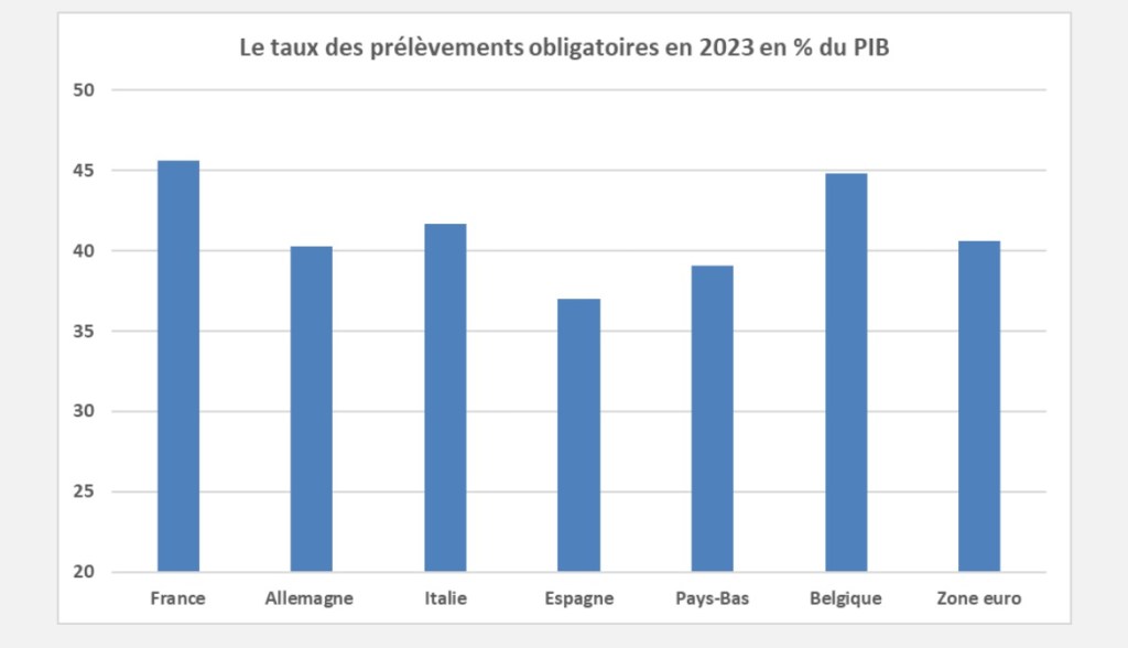 en 2023 : 45,6 % du PIB selon Eurostat) le pays est resté le premier de la zone euro. Il était supérieur de 5,0 points au taux moyen de la zone. 2024 et 2025 on constatera de nouvelles hausses.